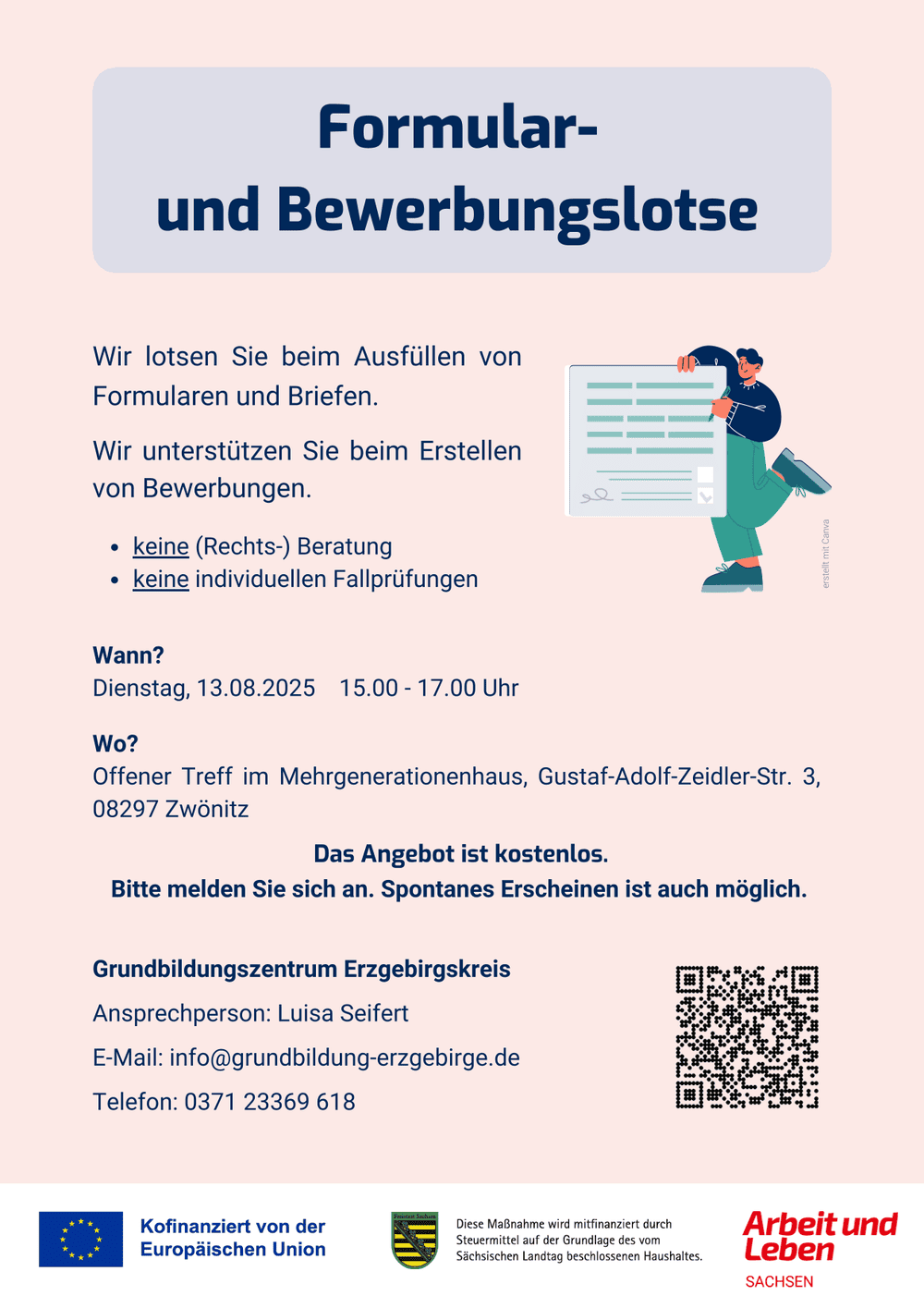 Seit dem 10.06.2025 findet je nach Bedarf im Johanniter-MGH Zwönitz im Offenen Treff das Angebot „Formularlotse“ statt. Hier helfen wir Ihnen beim Ausfüllen von Formularen, beim Beantworten von Briefen und Schreiben von Bewerbungen.