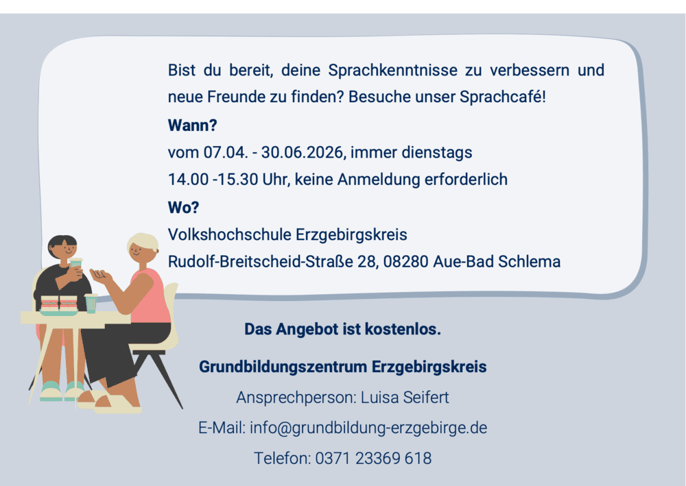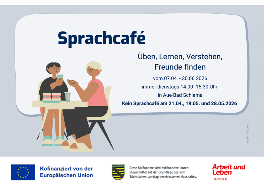 Vom 07.04.2026 bis zum 30.06.2026 findet jeweils dienstags von 14:00-15:30 Uhr das Sprachcafé in der VHS Aue statt.